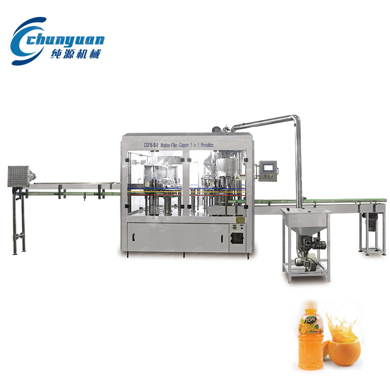 純源機械生產供應的全自動果汁飲料灌裝設備集沖洗、灌裝、封蓋三個功能組合在一個機體上,全過程實現(xiàn)自動化,適用于耐高溫聚脂瓶灌裝果汁飲料、果茶飲料,果汁熱灌裝機選用優(yōu)質的SUS304材料制作,主關件部件采用數(shù)控機床精密加工,果汁飲料灌裝機采用先進光電檢測各部件的運行狀況,具有無瓶不灌裝,無瓶不送蓋,自動化程度高,簡易的人機界面的操作顯示屏。