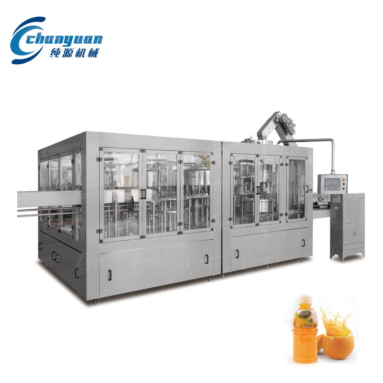 純源機械廠家供應的果蔬汁飲料機械集洗瓶、灌裝、封蓋于一體,適用于各種果汁、茶飲料的灌裝。