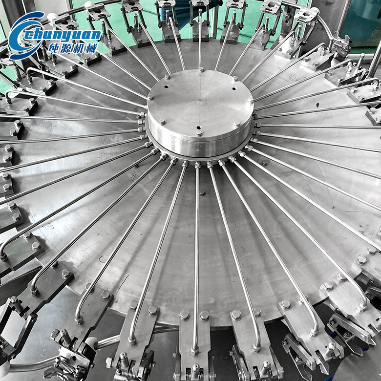 洗凈后的瓶子通過撥瓶星輪由沖瓶機(jī)導(dǎo)出并傳送至小瓶裝三合一純凈水設(shè)備。進(jìn)入灌裝機(jī)的瓶子由瓶頸托板卡住并在凸輪作用下將瓶子上升,然后由瓶口將灌裝閥頂開。灌裝采用重力灌裝方式。灌裝閥打開后物料通過灌裝閥完成灌裝過程,灌裝結(jié)束后瓶口下降離開灌裝閥,瓶子通過卡瓶頸過渡撥輪進(jìn)入旋蓋機(jī)。